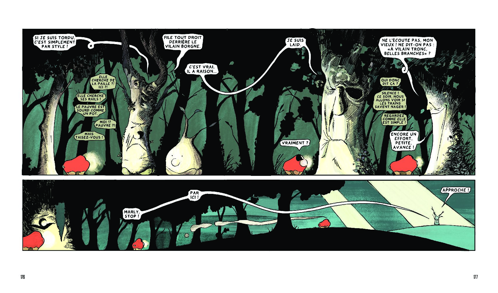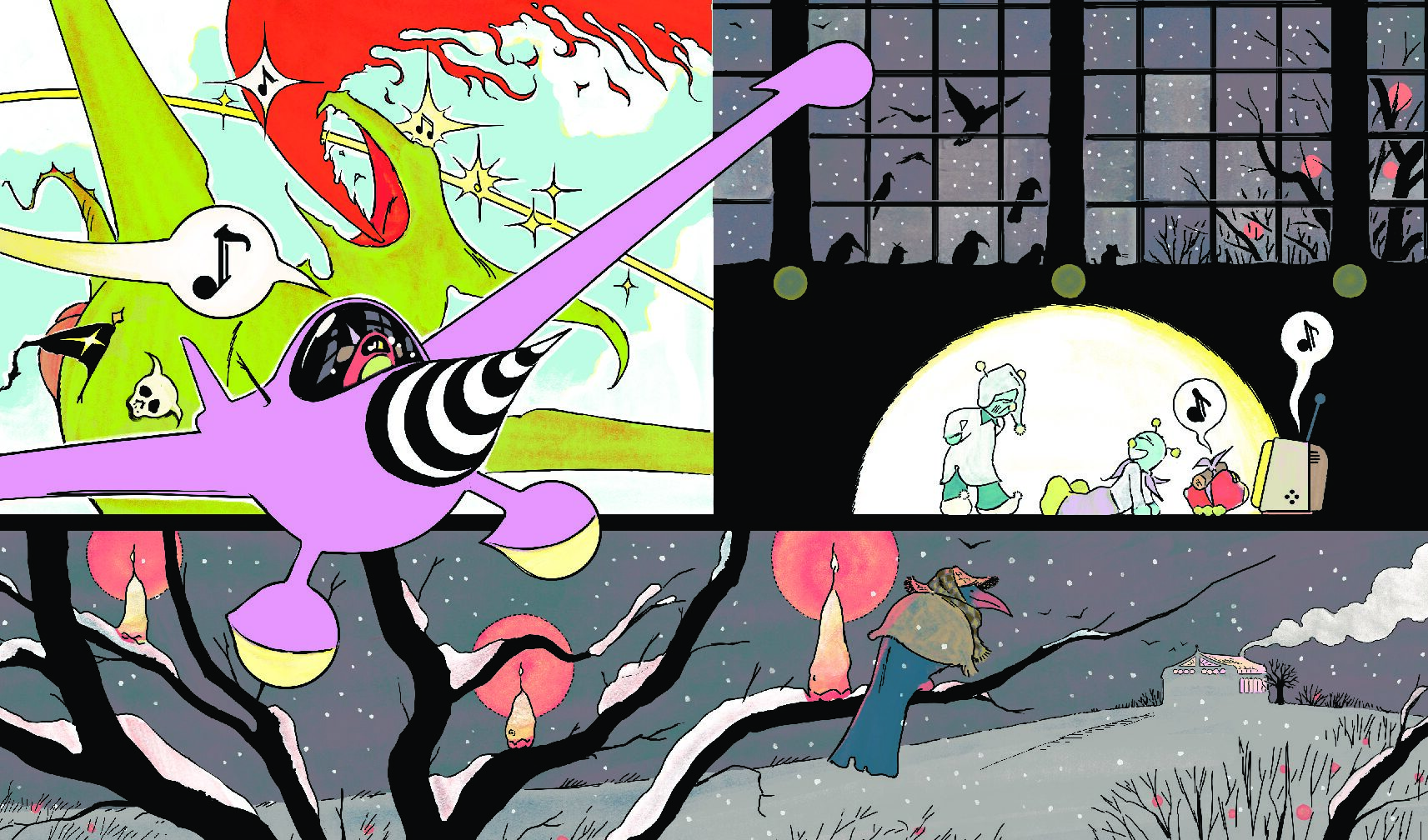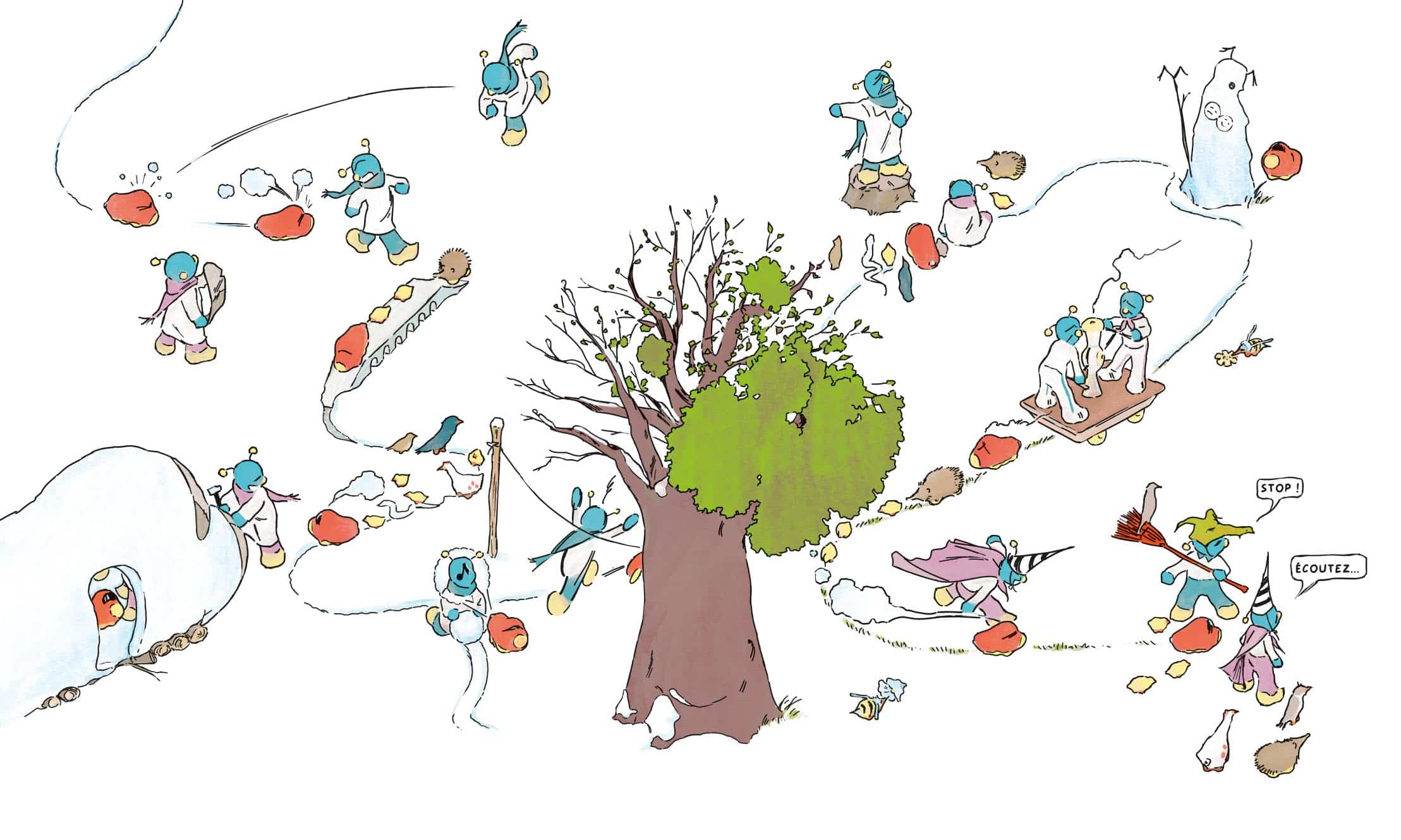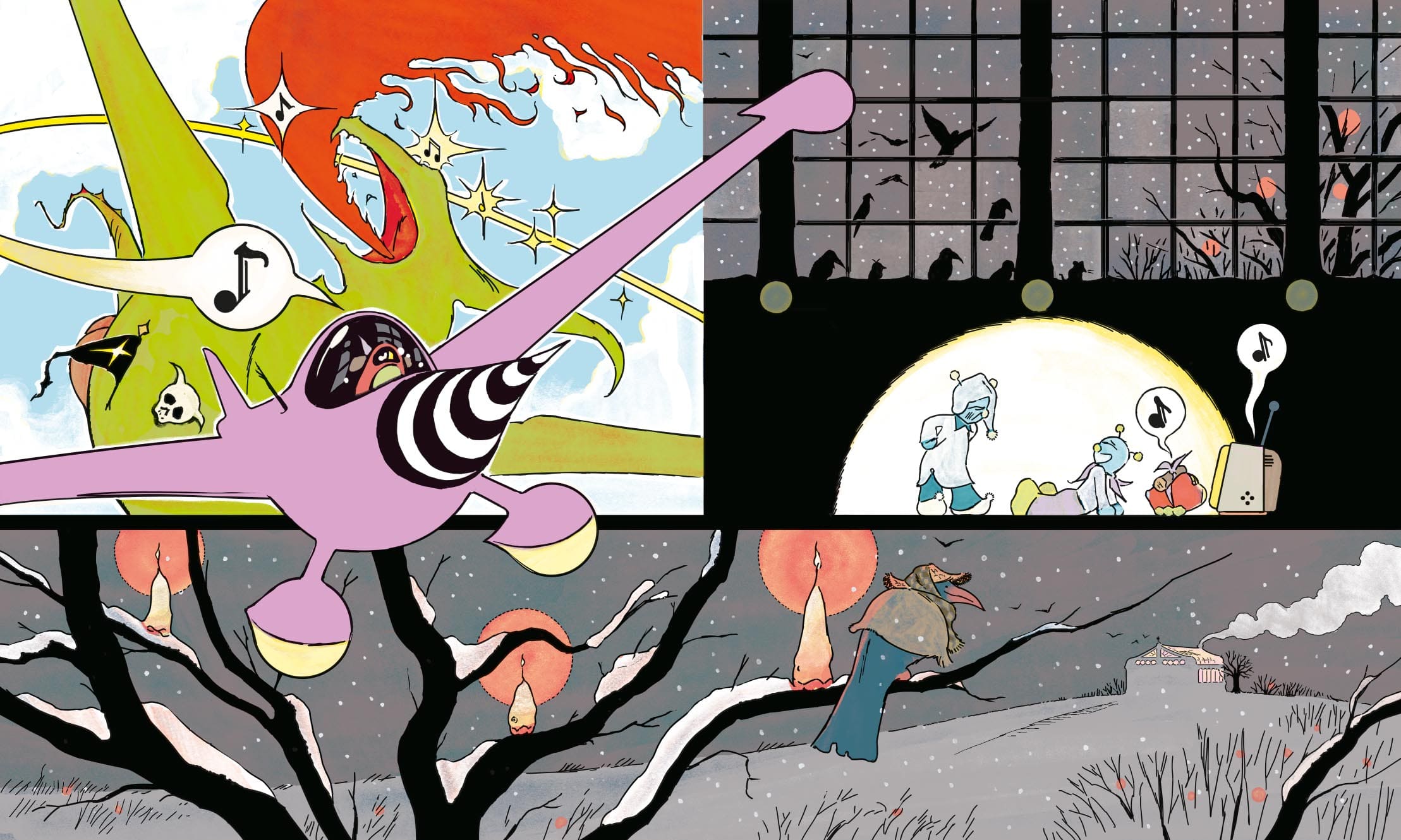Bienvenue dans un univers pastoral doux et étrange, à mi-chemin entre la féerie de Little Nemo et le foisonnement débridé de Jérôme Bosch. Ici, les oiseaux chantent, les sirènes ronflent, les arbres râlent et les maisons maisonnent.